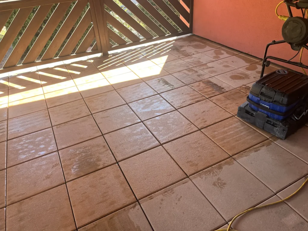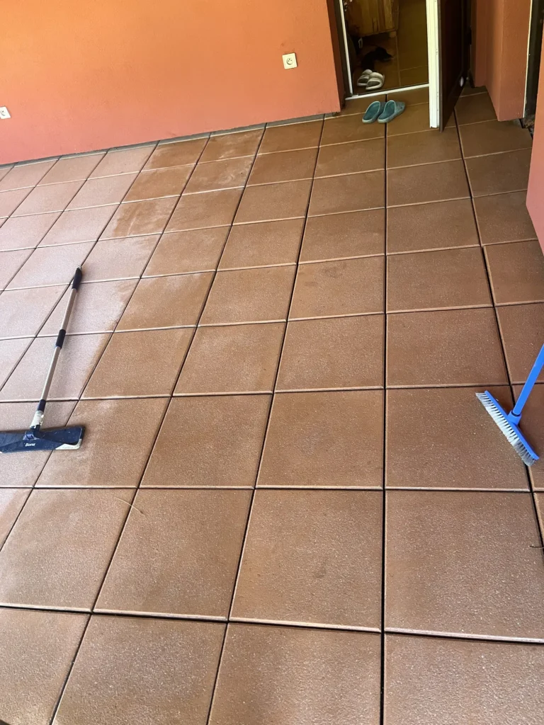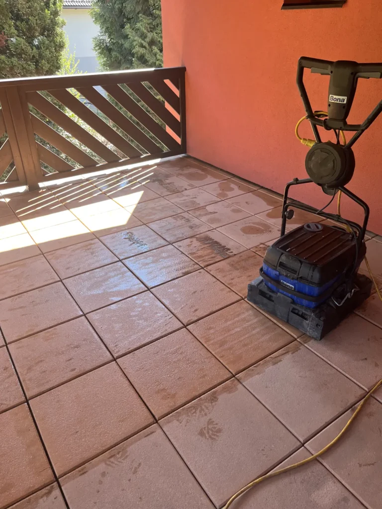 Betonová dlažba na terase časem sbírá nečistoty, které ruční mytí nedostane. Použili jsme profesionální čisticí stroj Bona, určený přímo pro údržbu podlahových povrchů. Výsledkem je čistá, obnovená plocha bez mechanického poškození dlažby.