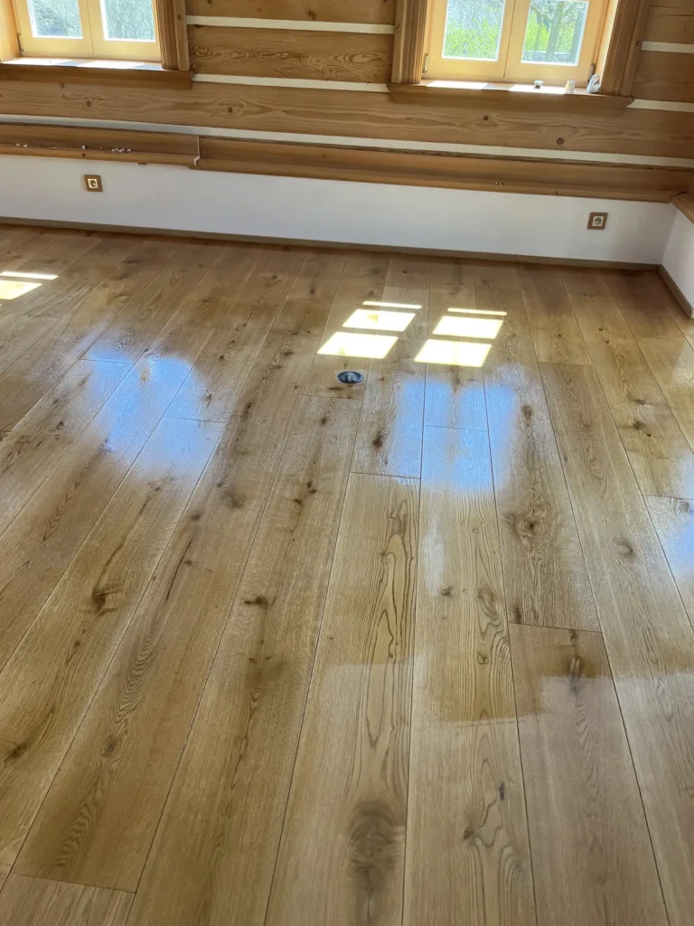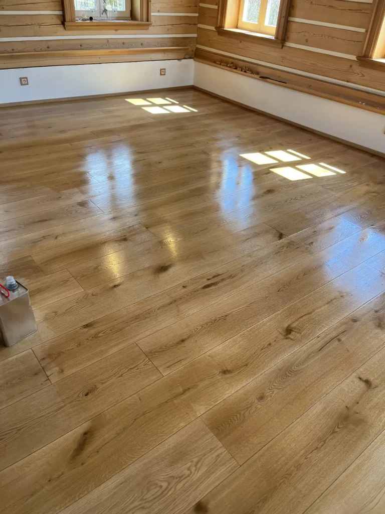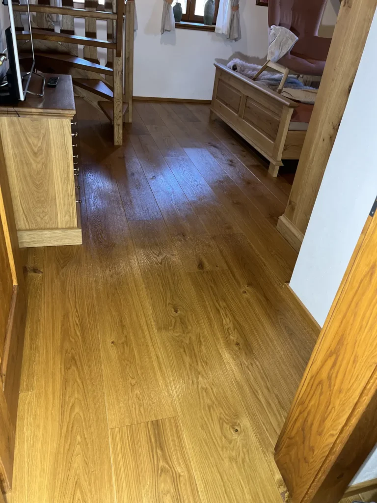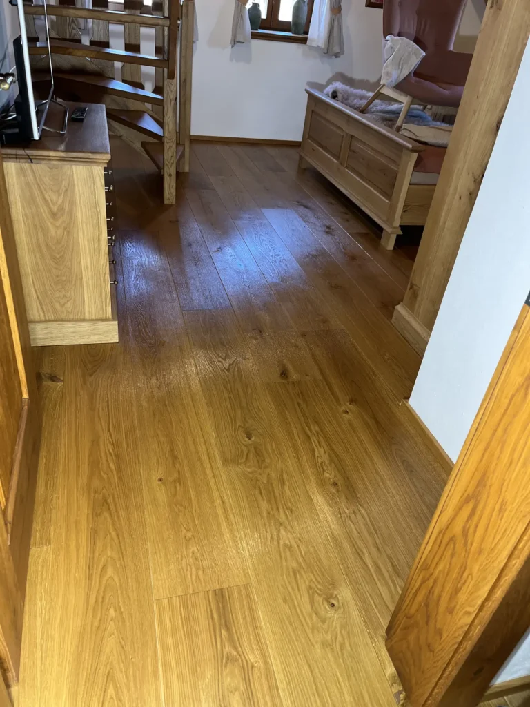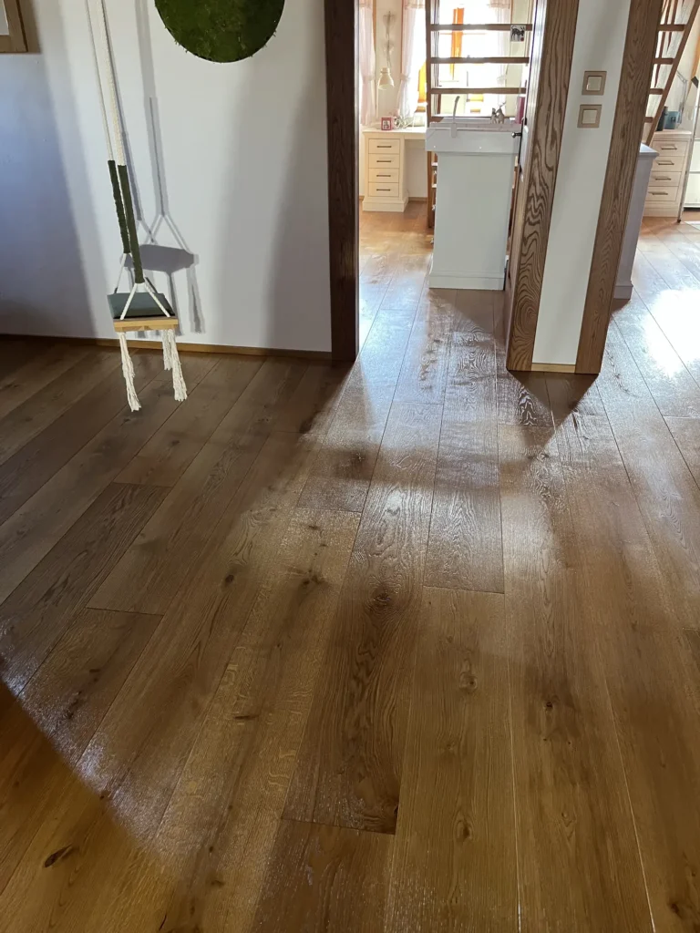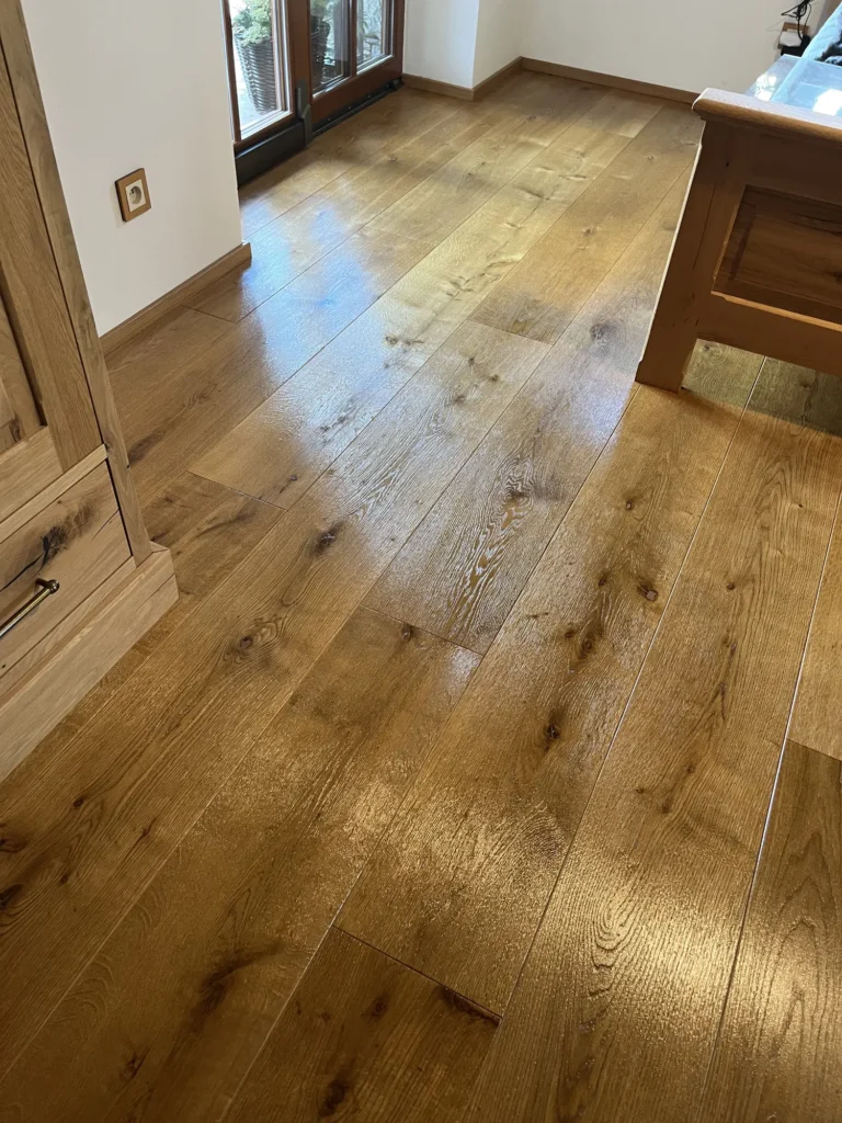 Olejovaná podlaha se renovuje jinak než lakovaná — nebrousí se do hola, ale jen do té míry, aby povrch přijal nový olej. Provedli jsme broušení dubové podlahy a aplikovali pečující olej Osmo, který obnoví ochranu a sjednotí vzhled celé plochy. Výsledkem je podlaha s přirozeným, matným povrchem.