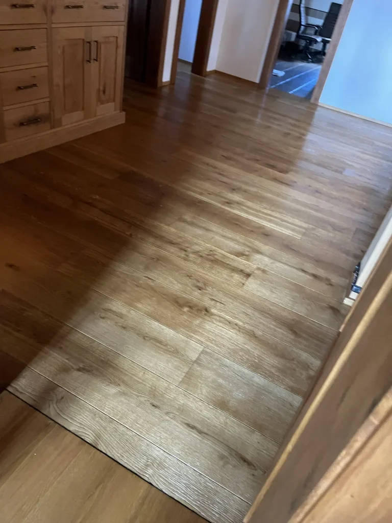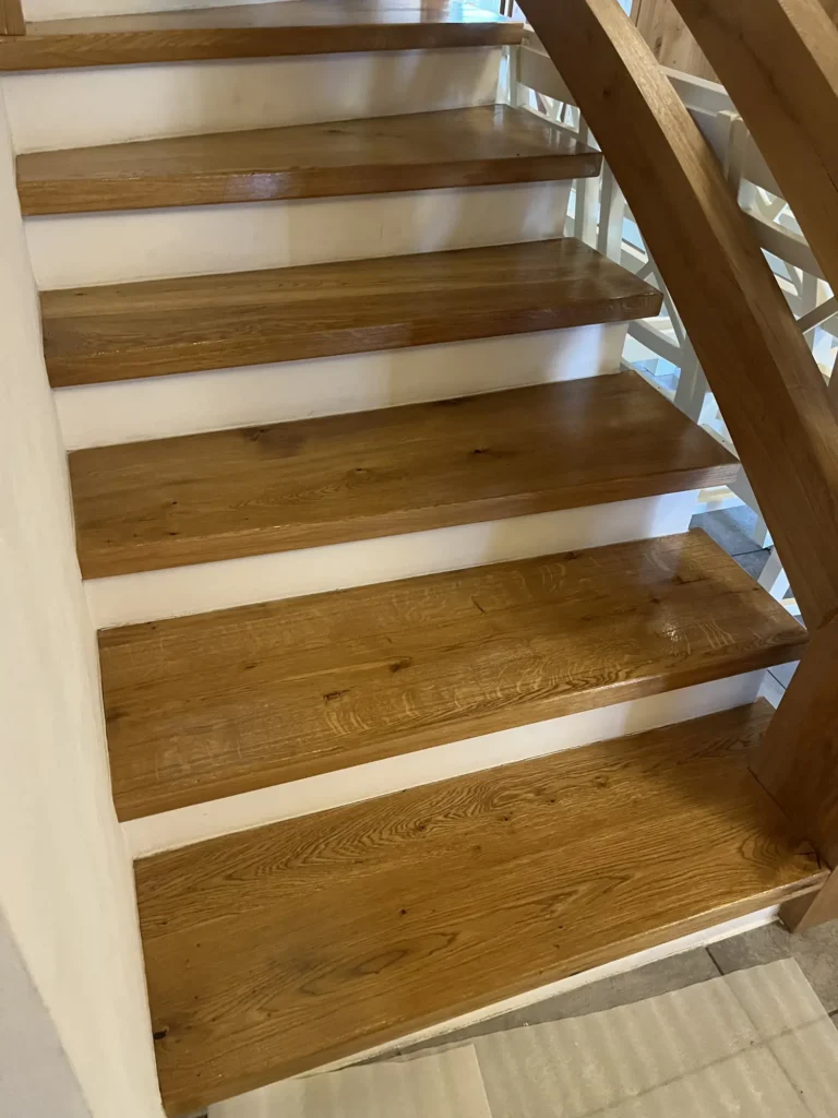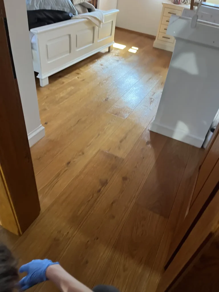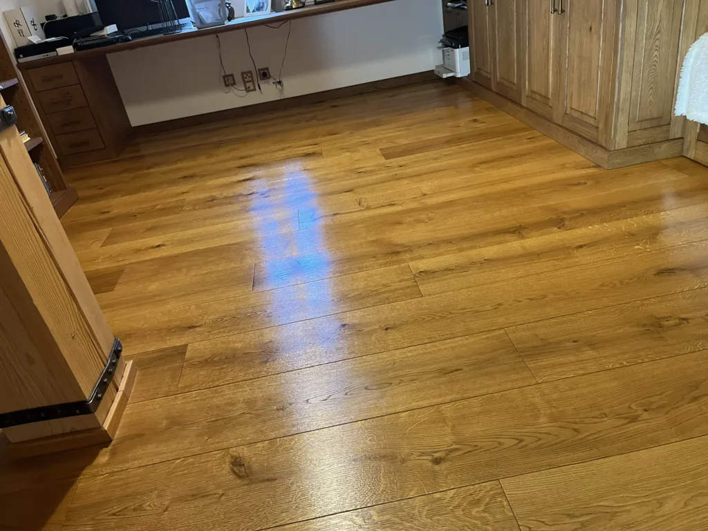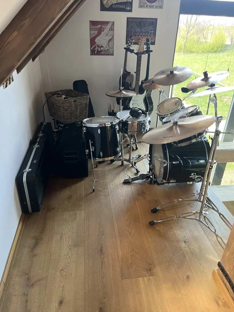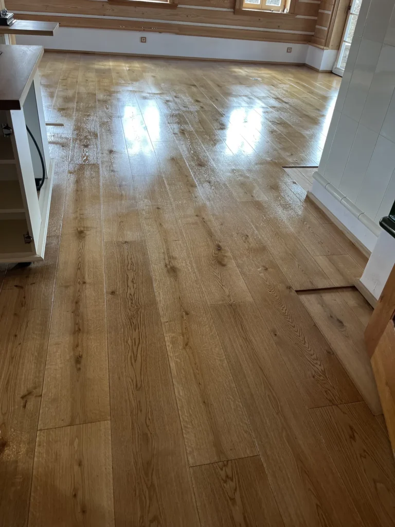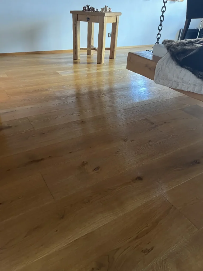 Olejovaná podlaha se renovuje jinak než lakovaná — nebrousí se do hola, ale jen do té míry, aby povrch přijal nový olej. Provedli jsme broušení dubové podlahy a aplikovali pečující olej Osmo, který obnoví ochranu a sjednotí vzhled celé plochy. Výsledkem je podlaha s přirozeným, matným povrchem.