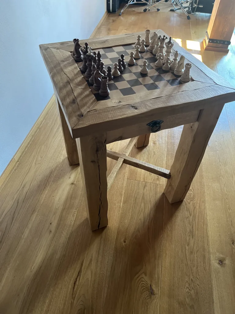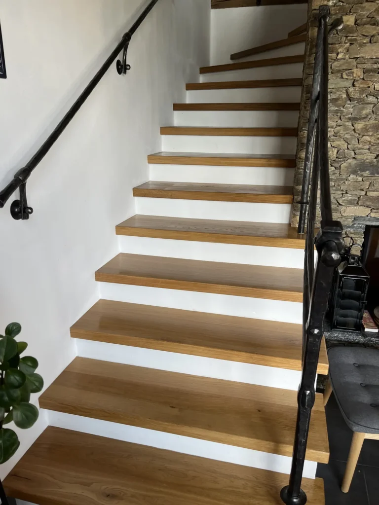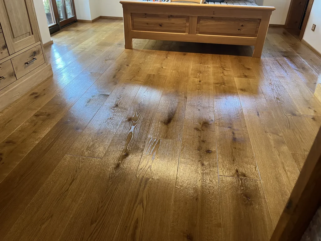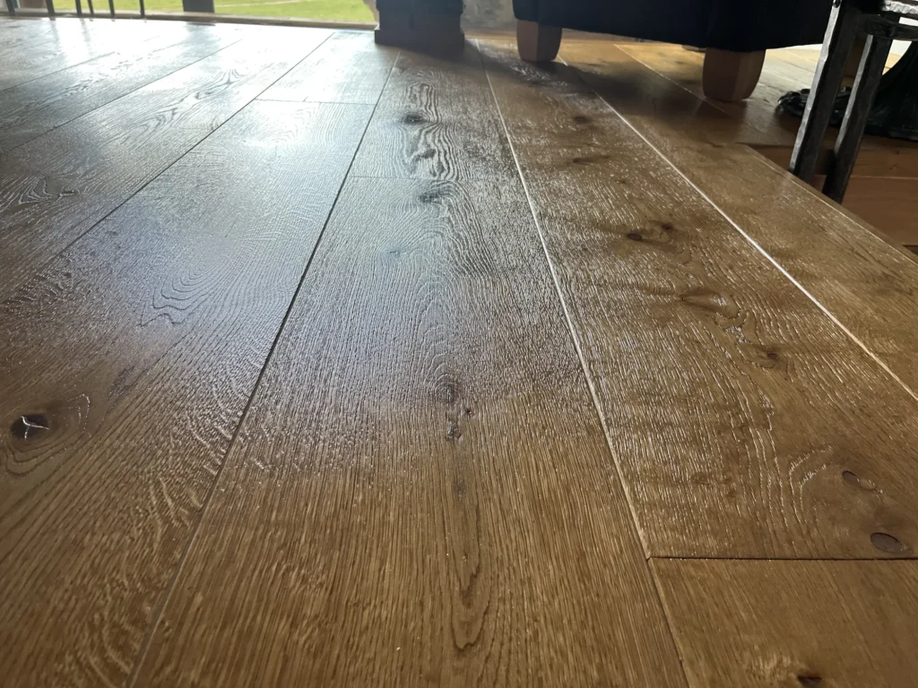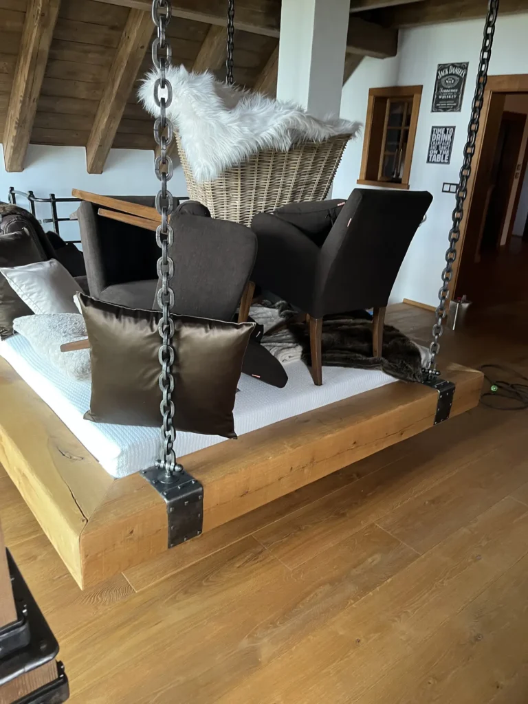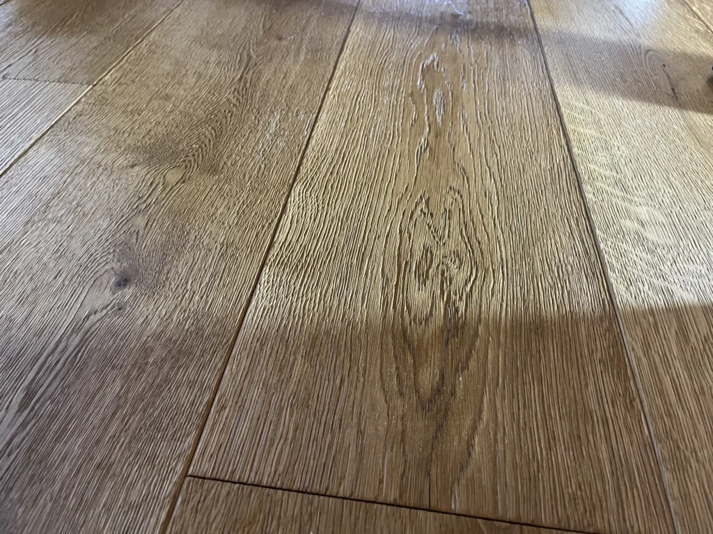 Olejovaná podlaha se renovuje jinak než lakovaná — nebrousí se do hola, ale jen do té míry, aby povrch přijal nový olej. Provedli jsme broušení dubové podlahy a aplikovali pečující olej Osmo, který obnoví ochranu a sjednotí vzhled celé plochy. Výsledkem je podlaha s přirozeným, matným povrchem.