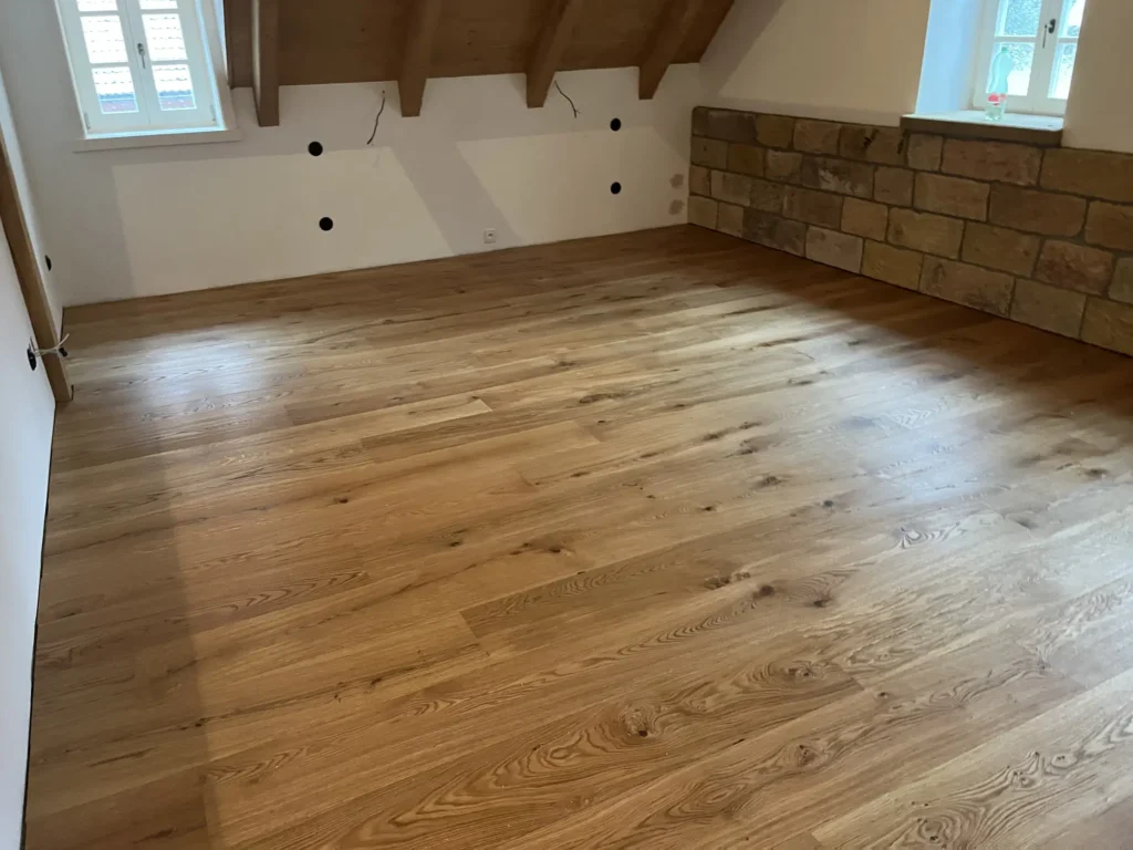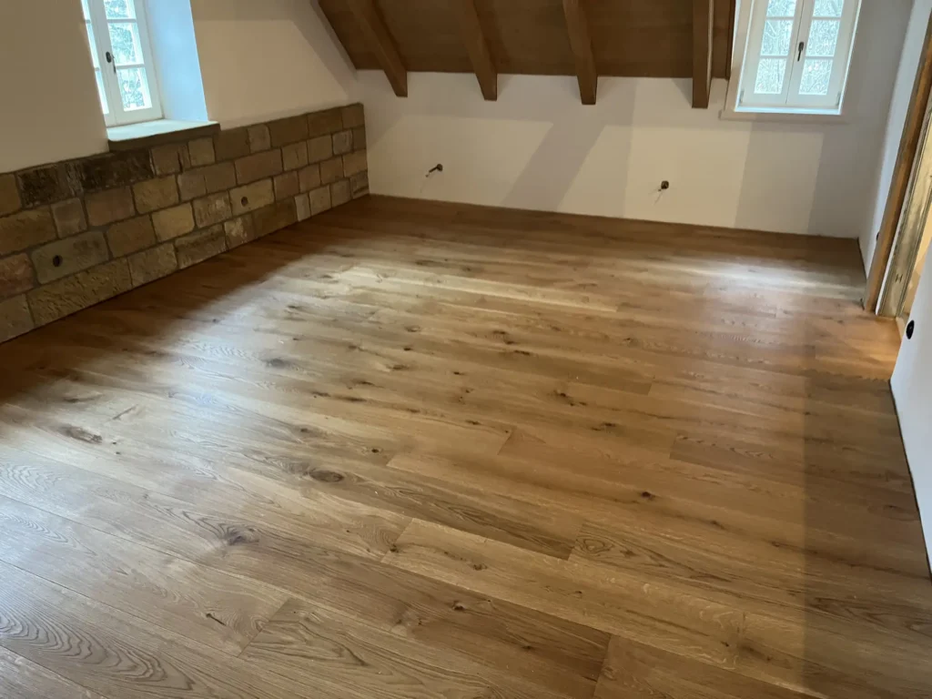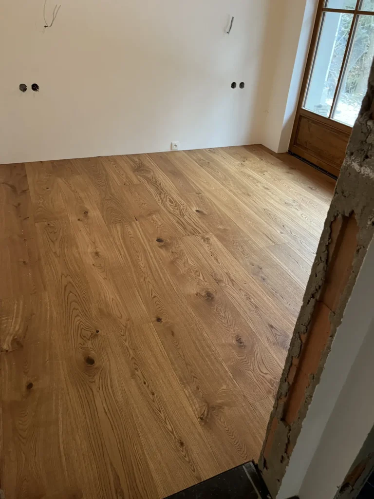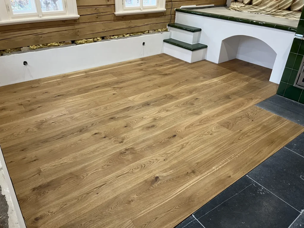 Dřevěná podlaha v roubence je přirozenou volbou — materiál ladí s charakterem stavby. Třívrstvá konstrukce dubových prken lépe snáší výkyvy vlhkosti typické pro roubené objekty než masiv. Provedli jsme pokládku třívrstvé dřevěné podlahy v celém prostoru.