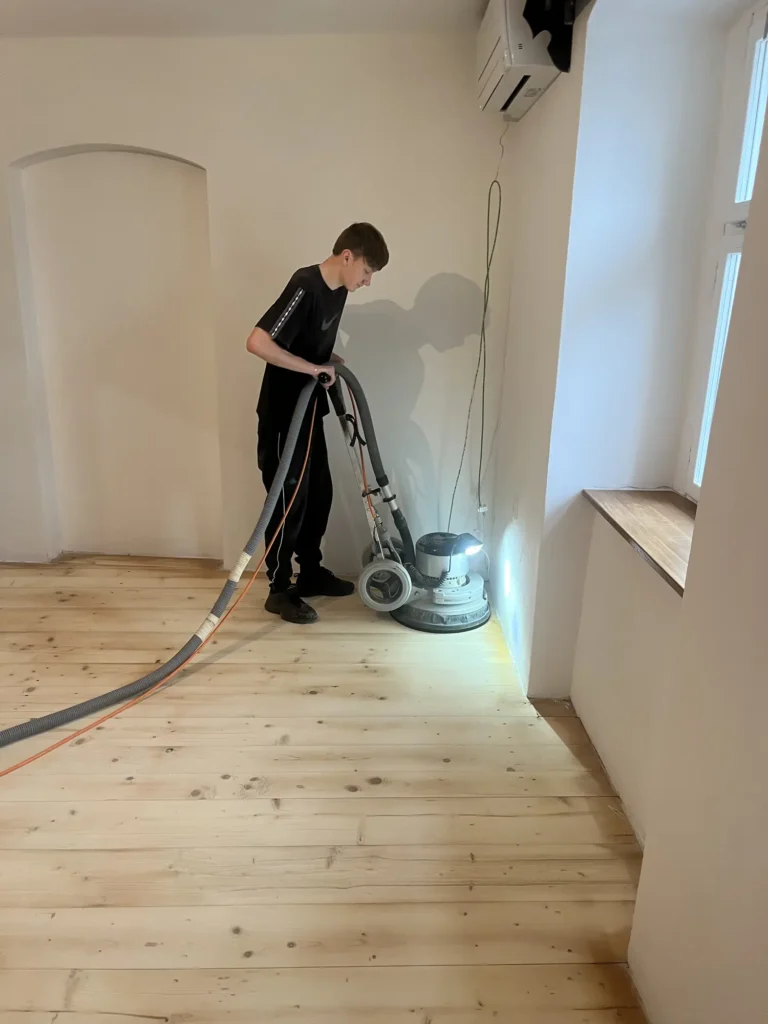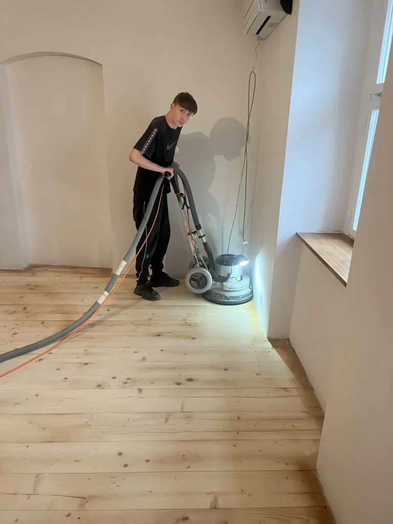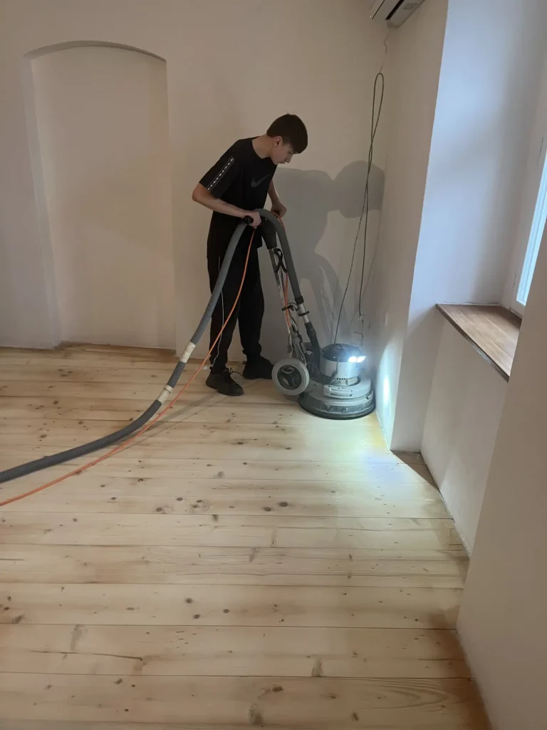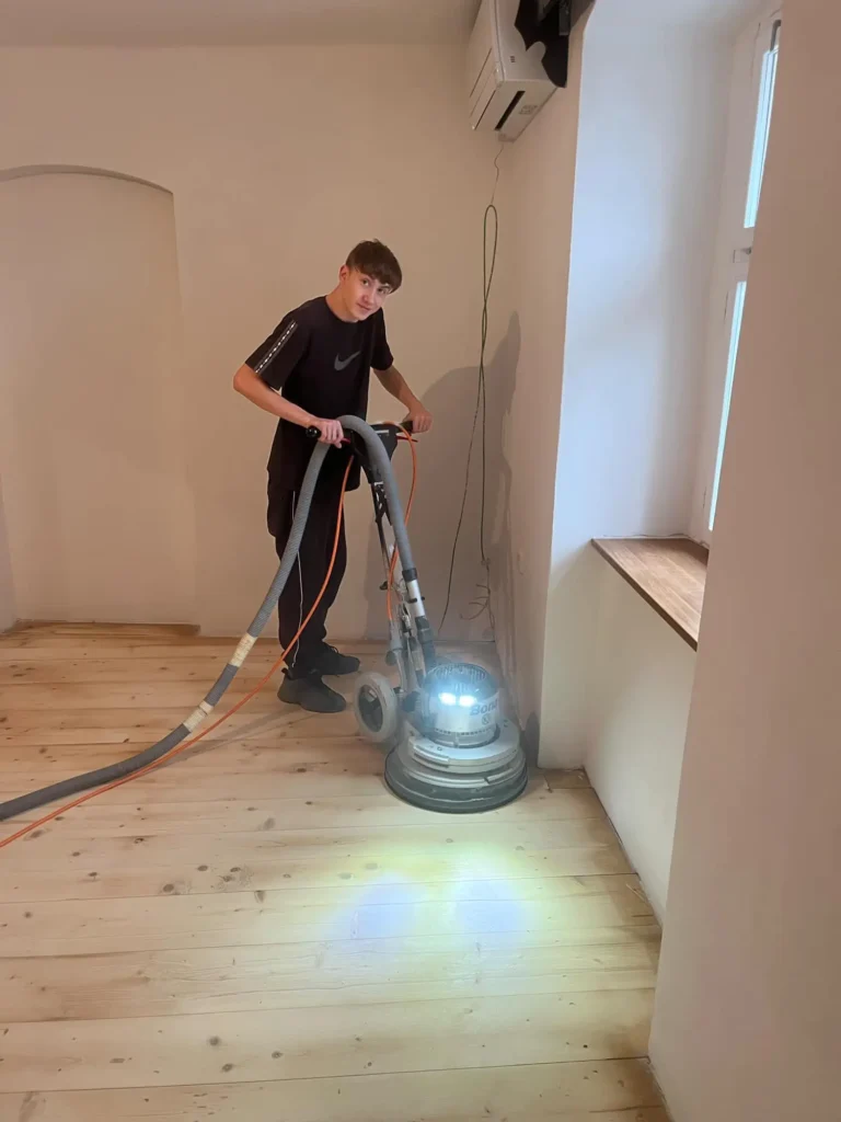 Dřevěná podlaha v roubence je přirozenou volbou — materiál ladí s charakterem stavby. Třívrstvá konstrukce dubových prken lépe snáší výkyvy vlhkosti typické pro roubené objekty než masiv. Provedli jsme pokládku třívrstvé dřevěné podlahy v celém prostoru.